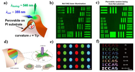 RLs are one class of innovative speckle-free intense light sources for advanced imaging apparatus because they combine the two advantages of high light output and low spatial coherence. In 2019, the perovskite RL for speckle-free imaging application was first reported by Wang et al. [84]. They fabricated a flexible perovskite RL by embedding curved MAPbBr3 perovskite thin film on the flexible polyimide substrate. They quantitatively analyzed the degree of spatial coherence and imaging capability of the MAPbBr3 perovskite RL. The results showed that the first-order spatial coherence of RL was less than 0.12, which was approximately one order lower than conventional Nd-YAG lasers. The image test further proved that perovskite RL was the ideal light source for high-quality speckle-free imaging (Figure 5a–c). Zhang et al. further demonstrated a miniaturized perovskite optical fiber RL for speckle-free imaging [86]. In this work, the MAPbBr3 perovskite films on the optical fiber’s end-face were first fabricated using the dip-coating method. The fabrication process included two steps. The optical fiber tip was first dipped into the PbBr2/DMF solution to obtain a layer of PbBr2 on the fiber facet. Afterward, the optical fiber tip was dipped into the MABr/isopropanol solution. After annealing at 70 °C for 20 min, the MAPbBr3 films on the optical fiber’s end-face were obtained. Using a 150-fs laser as a pump source, random lasing with a threshold of 32.3 μJ/cm2 was clearly observed. The divergence angle of the obtained laser beam was less than 60°. This directional RL is caused by the lower absorption in thinner films with small divergence angles and the refraction at the interface between the hemispherical perovskite film and air. The spatial coherence of the lasing was measured as γ = 0.6279, which was lower than that of traditional 532-nm continuous-wave (CW) lasers (γ = 0.9344). Moreover, the speckle contrast of RL was approximately 15 times lower than traditional lasers. In 2020, the perovskite RL was used for the holographic image projection by Mallick et al. [87]. They fabricated a perovskite–polystyrene 10 wt%-based RL using a solvent-engineered process. The polystyrene on perovskite films induced a low laser divergence angle of ≈100. Using this RL as a holographic image light source, the authors produced a significant speckle-free holographic image projection.