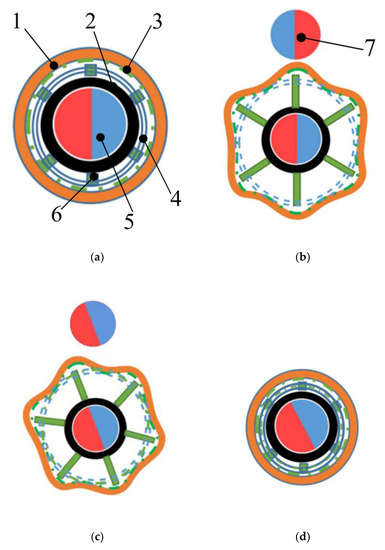 Biopsy process. (a) Initial status, (b) expanding legs, (c) rotating CR, (d) contracting legs. 1. Intestine, 2. Capsule shell, 3. Intestinal fluid, 4. Spring, 5. Internal radially magnetized magnet, 6. Leg, 7. External radially magnetized magnet.