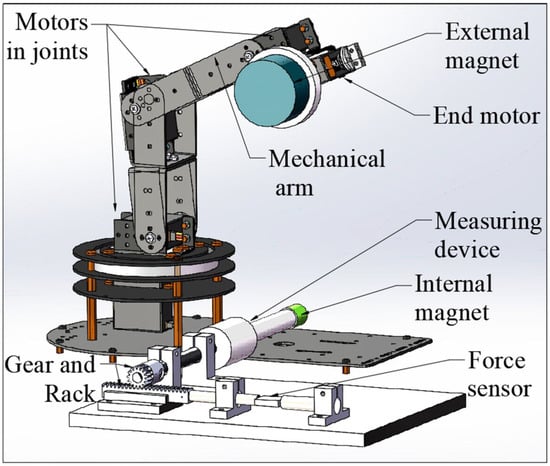 Based on Equation (1), the measuring system should obtain the torques at different axial distances between two magnets (“D”) and different angles of two magnetic poles (“θ”). As shown in Figure 3, the system mainly includes a mechanical arm, an external magnet, an internal magnet, a measuring device, and a data acquisition device. The mechanical arm is used to move and rotate the external magnet, which is controlled by Robot Operating System (ROS) software. The core mechanism of the measuring device is a gear and rack pair, which can convert the torque into the tangential force (FT) of the gear. The data acquisition device is mainly composed of an NI industrial computer (NI PXIe-1084) and data acquisition card, Labview2019 software, and force sensor (FUTEK LSB205), which is used to measure “FT” from the gear rack.