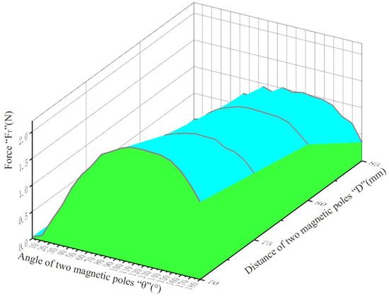 The external magnet is controlled to rotate 10° every time until 180° so that the θ changes from 0° to 180°. Record the force (FT) from LABVIEW. Then control the mechanical arm to move down 5 mm every time until 70 mm and repeat the above steps. Figure 5 shows FT at different D and θ.