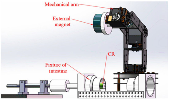 As shown in Figure 7, in the experiment, we use a freshly isolated pig intestine to imitate a human intestine. The intestine is mounted on the fixture of the intestine, the CR (with contracted legs) is placed into the intestine through one side of the fixture, and then the micro camera is put into the intestine through the other side of the fixture to observe the CR in the intestine.