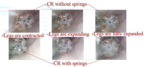 As shown in Figure 8, the CR with springs has a better effect on expanding intestinal folds, which means that the CR with springs can better collect the pathology samples that are hidden in intestinal folds. Concurrently, no intestine is clamped by the CR.