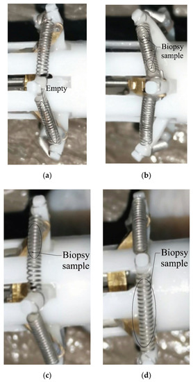 In the biopsy experiment, there are four sampling situations of the biopsy sample inside a spring. As shown in Figure 9, Situation 1 is that there is no sample in the spring, Situation 2 is that there is a small sample in the spring (less than 1/2 the volume of a spring), Situation 3 is that there are many samples in the spring (more than 1/2 the volume of a spring), and Situation 4 is that the springs are full of the samples.