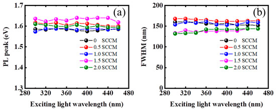 Emission peak position (a) and the full width at half maximum (b) with the variation of the excitation wavelength for the films prepared at different NH3 flow rates, respectively.