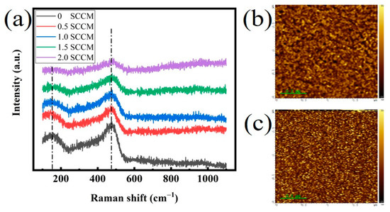 (a) Raman scattering spectra of the films prepared at different NH3 flow rates, (b,c) atomic force microscopic images of the films prepared by different NH3 flow rates of 1 sccm and 2 sccm, respectively.