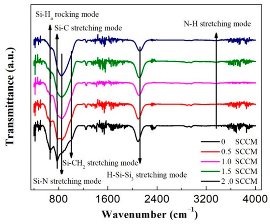 Films were analyzed with an FTIR spectrometer to further explore the bonding configuration of films prepared with different NH3 flow rates. The results are shown in Figure 4. The FTIR absorption spectrum for the film prepared without NH3 mainly displays the following vibrational bands [6,16]: the absorption band at 640 cm−1 corresponds to the rocking vibration mode of SiHn, the 780 cm−1 band is related to the stretching vibration mode of Si–C, the 1250 cm−1 band corresponds to the stretching vibration mode of Si–C, and the 2100 cm−1 band is attributed to the stretching vibration mode of H–Si–Si3. The FTIR absorption spectrum clearly showed the feature of Si-rich SiCx. One can see that the rocking vibration mode of SiHn at 640 cm−1 and the stretching vibration mode of H–Si–Si3 at 2100 cm−1 gradually weaken with the increase in NH3 flow rates. In contrast, the stretching vibration mode of Si–N appears and becomes intense with the addition of NH3. With the NH3 flow rate increasing from 0.5 to 2 sccm, the density of Si–N bond is estimated to be increased from 0.2 × 1022 cm−2 to 0.7 × 1022 according to the following equation [19]:
