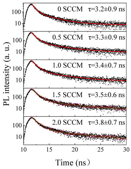 Figure 5 shows the PL decay traces of films prepared under different NH3 flow rates. The decay process in each case can be properly fitted with a biexponential function as follows: