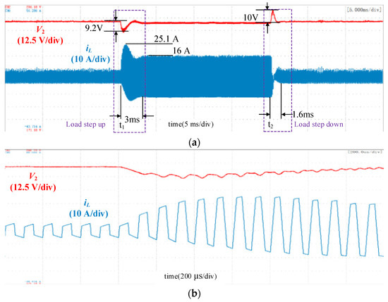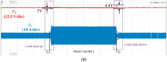 Figure 10 shows the waveform using the conventional single-loop control. The inductor current shows obvious transient DC bias during abrupt load change. When the load increased, the peak current reached 25.1 A, and the current overshoot was 9.1 A. In the experiment, both the static and dynamic performances under load increase and decrease were considered when tuning the PI parameters. The waveform showed that the voltage sag was 9.2 V, and the settling time was 3 ms when the load increased. The voltage overshoot was 10 V, and the settling time was 1.6 ms when the load decreased. Figure 11 shows the waveform using the double-closed-loop control. The inductor current was symmetrical, and the transient DC bias was eliminated. When the load increased, the voltage sag was 8.2 V, and the settling time was 1.9 ms. The voltage overshoot was 9 V, and the settling time was 1.3 ms when the load decreased.