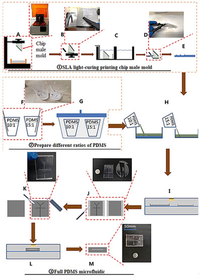 The preparation process of the micro-droplet chip is shown in Figure 1. The preparation of the micro-droplet chip is divided into three steps: ① SLA light-cured printing chip convex mold, ② different ratio of PDMS preparation, and ③ full PDMS microfluidic chip molding. Among them, A-E is the printing process of the chip convex mold, F-G is the PDMS preparation process of different proportions, and H-L is the full PDMS microfluidic chip molding process.