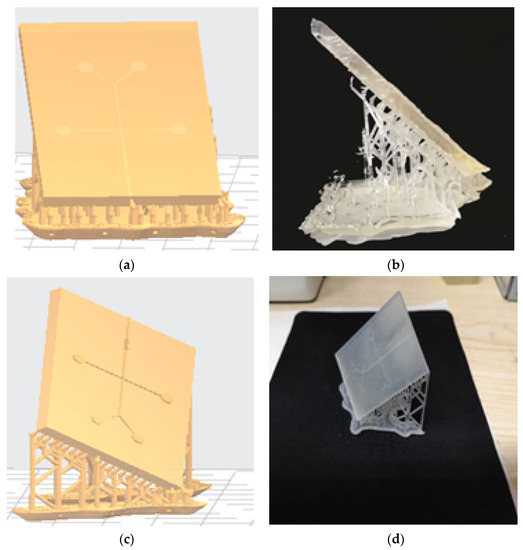 Figure 3. (a) Non-single-angle printing three-dimensional model; (b) non-single-angle printing effect diagram; (c) single-angle printing three-dimensional model; (d) single-angle printing effect.