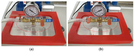 The prepared substrate PDMS and cover sheet PDMS were placed in a transparent vacuum chamber for 30 min. The pressure in the vacuum chamber was maintained at −1 bar through a vacuum pump. As shown in Figure 5, it can be seen from Figure 5b that a lot of bubbles emerge in a negative pressure environment. These bubbles are generated during the preparation and stirring process.