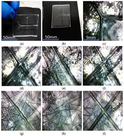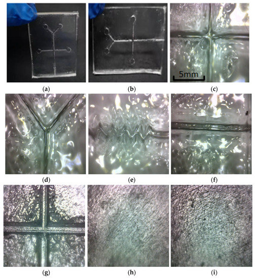 Molding state after drying at 80 °C. The surface-forming effect of the runner shown in the diagrams (a–f) is good, without too obvious defects; but there are obvious cracks on the surface of the chip in contact with the mold. The convex mold of the substrate shown in (g–i) has obvious cracks during the drying process.