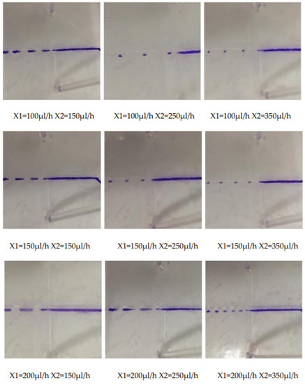 According to the three sets of data of the disperse phase flow rate X1 as 100 μL/h, 150 μL/h, 200 μL/h, set the continuous phase flow rate X2 with the difference of 10 arithmetic sequence to increase slowly, and observe the drop size situation, the experimental results are shown in Figure 10.