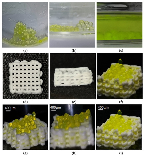 Calcium silicate powder and polyvinyl alcohol (PVA) solution are mixed to prepare a printing material, and the three-dimensional scaffold structure is printed out by a 3D-bioplotter printer and sintered to obtain a biological scaffold for supporting microspheres, as shown in Figure 14d,e. The micro-droplet of sodium alginate-containing cells is formed by the micro-droplet chip and dropped onto the rectangular biological scaffold soaked in calcium chloride solution. Due to the cross-linking reaction between the sodium alginate micro-droplets and the calcium chloride solution, the micro-droplets become microspheres and are fixed on the biological scaffold, as shown in Figure 14f–i.