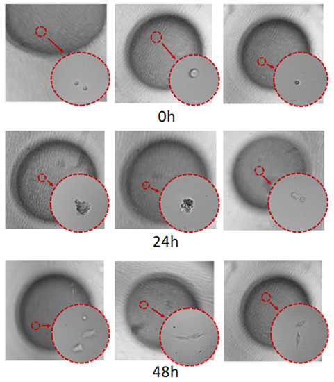 After the cells were cultured for 0 h, 24 h, and 48 h, the Petri dish containing the microsphere droplets with 3D morphology was taken out of the incubator. Place the Petri dish under the YDF-880 fluorescence microscope for microscopic observation, and take pictures of the cell culture through the image acquisition function of the microscope. The culture of chondrocytes on the chip is shown in Figure 15. The picture shows the growth of chondrocyte cells. It can be seen from Figure 15 that the cells are growing well, and the cells have begun to divide and pass down. This verifies that the chip customized in this article can perform 3D cell culture well and meet the experimental requirements for 3D cell culture.