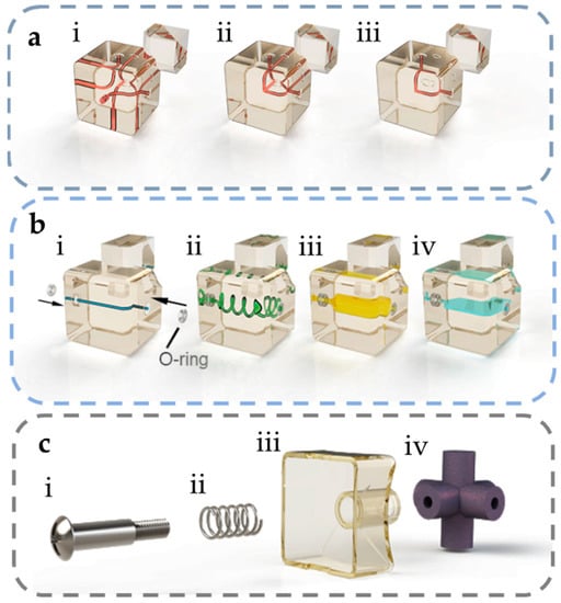 The design of the major components of the Rubik’s cube-like microfluidic cube: (a) the corner blocks, including in/outlet (i), turning (ii), and junction (iii) blocks; (b) the edge blocks, including straight (i) and spiral (ii) channels, 3D (iii), and planar (iv) chambers; (c) other parts of the cube, including the screw (i), spring (ii), center block (iii), and cube core (iv).