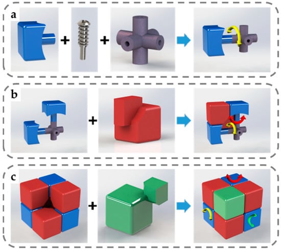It should be noted that the Rubik’s cube modules are not simple cubes but three-dimensional shapes with additional protrusions and dents for interlock, as depicted in Figure 3. Taking the top layer of the rotating Rubik’s cube as an example, the protrusions on all the parts in the top layer can be embedded in the depression on the middle layer, and such interlock of the public surfaces ensures that the top layer of the whole module can only rotate around a single axis, as shown in Figure 4a. Therefore, the parameter setting of the public curvature on the edge block, corner block, and center block is the key to achieving smooth rotation and maintaining the unity of the Rubik’s cube. When the radius of public curvature is too large, the center block of the cube will become thinner, and the resulting deformation will easily cause the Rubik’s cube to fall apart in the process of rotation. When the radius of curvature is too small, the connection between the protruding structure and the edge/corner blocks will be weak, which makes them prone to deformation and fracture.