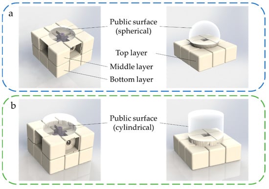 The interlocking of the top layer and the rest of the Rubik’s cube when the top layer rotates: (a) the spherical surface is used as the public surface; (b) the cylindrical surface is used as the common surface.