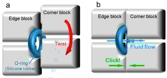 In order to deal with these problems, a microfluidic module alignment and sealing strategy based on silicone O-ring is proposed. Since the liquid leakage comes from the gap caused by the non-conformal contact between rigid modules, flexible materials are considered to be added between microfluidic modules to achieve complete fitting through the deformation of materials. Figure 5 shows the O-ring sealing strategy. On the edge block of the Rubik’s cube, annular grooves are designed around the entrance and exit of the microfluidic channel, which can be used to embed the silicone rubber O-ring. A small part of the silicone O-ring is exposed after embedding. There is also an annular groove on the corner block of the Rubik’s cube, whose contour is also the same as the O-ring, but the depth is shallow, as shown in Figure 5a. When the cube is rotated, the O-ring, which is embedded in the edge block, rotates with it and slides on the surface of the adjacent block. When the Rubik’s cube rotates completely and the microfluidic channel reaches the alignment position, the exposed part of the O-ring embedded in the edge block automatically fits into the groove on the corner block. At this time, the O-ring deforms under the spring thrust and fully fits the unsmooth surface on the edge block and corner block, thus avoiding leaving gaps between modules (Figure 5b). In addition, when rotating to the aligned position, the O-ring embedded in the corner block can increase the friction between the edge block and the corner block and prevent further relative displacement from achieving the automatic alignment between the edge block and the corner block.