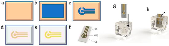 (a–f) Fabrication of three-electrode electrochemical sensor: the DBC ceramic substrate (a) laminated by a layer of photosensitive film (b); (c) the patterned photosensitive film is obtained after exposure and development; (d) copper is etched to obtain electrodes; (e) electroplating the electrode surface to obtain the gold three-electrode sensor; (f) illustration of the WE, CE, and RE of the three-electrode electrochemical sensor; (g,h) assembling the electrochemical sensor module; (g) inserting the electrochemical sensor into the edge block frame; (h) applying epoxy to the gap between the electrochemical sensor and the edge block for sealing.