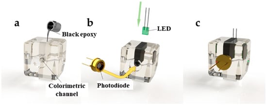 Colorimetric sensing module fabrication and assembly: (a) cast black epoxy resin at the periphery of the colorimetric channel in the 3D-printed colorimetric module; (b) assembly of the LED and silicon photodiode into the module; (c) the colorimetric sensing block after assembly.
