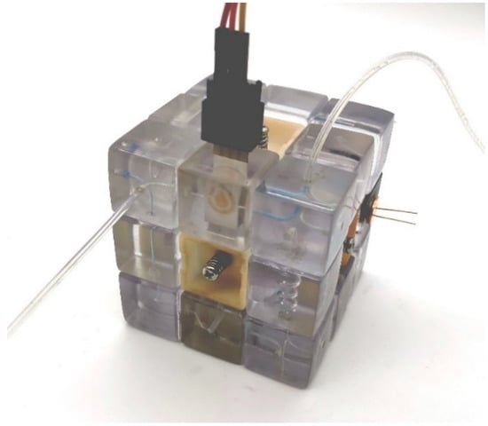 Before assembling the microfluidic cube, silicone O-rings should be embedded in the two concave surfaces of all 12 edges, and then M3 threads should be drilled into the 6 holes of the cube core by manual thread tapping. Then the microfluidic cube should be assembled in the same way as the ordinary Rubik’s cube: First, five of the center blocks of the Rubik’s cube were connected to the central rotating shaft through the screws of M3 × 20 mm, and the springs of 0.6 mm (wire diameter) × 6 mm (helix diameter) × 15 mm (length). Then, the edge blocks and corner blocks of the Rubik’s cube were added to the assembly layer by layer. Finally, the remaining center block was connected to the rotating shaft of the Rubik’s cube. The tightness of the screws was adjusted so that each face of the cube rotated with moderate resistance. At this point, the microfluidic cube assembly was complete, as illustrated in Figure 8. We tested the pressure resistance of the microfluidic cube by blocking the outlet of the configuration and gradually increasing the inlet pressure. We tested the leakproofness of the system. Since the pressure resistance is tunable by adjusting the screws, the screws are tightened to a medium level, approximately four cycles of rotation (which is 2 mm into the cube core), and the setup for the test is shown in Figure S4. No leakage is observed in the process when inlet pressure is increased to 5.0 bar, demonstrating that the leakproofness of the assembly is sufficient for most microfluidic applications.
