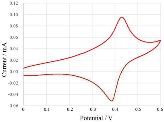 Firstly, the cyclic voltammetry curve of 0.1 mmol/L (K3[Fe(CN)6]) solution was tested. The scanning interval was 0–0.6 V, and the scanning rate was 100 mV/s. Figure 10 shows the cyclic voltammetry curve of (K3[Fe(CN)6]). It can be observed that the oxidation peak appears at 0.430 V and the reduction peak appears at 0.386 V. The difference between the two seals is 0.044 V. The peak currents were 0.048 mA and 0.056 mA, respectively, and the ratio of peak currents was 85.7%.