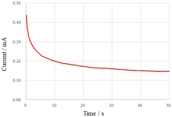 Then, the K3[Fe(CN)6] solution was tested using the chronoamperometry method. The I-t curve was recorded at an initial voltage of 0.43 V for the (K3[Fe(CN)6]) solution with a series of concentrations ranging from 0.1 mmol/L to 1 mmol/L. Figure 11 shows the I-t curve of 1 mmol/L. It is observed that the current tends to stabilize after 50 s, so the current at 50 s is taken as the steady-state current.