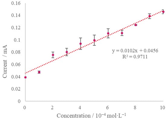Figure 12 shows the steady-state current variation with different concentrations of K3[Fe(CN)6] solutions. As can be seen from the figure, the sensor exhibits reasonable linearity and sensitivity for timed current detection of K3[Fe(CN)6] and is expected to be usable for microfluidic detection applications with appropriate modifications.