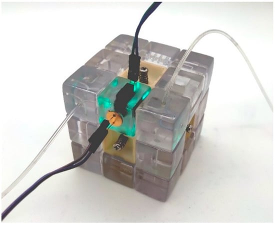 Illustration of the microfluidic cube integrated with the custom sensing modules.