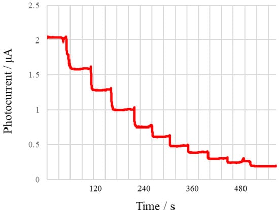 Figure 14 shows the curve of photocurrent change with time. The photocurrent is the current generated by the photoelectric effect in the light-receiving photocells and is proportional to the light intensity received by the detector. It can be observed that after infusion of a higher concentration of glucose solution, the photocurrent value is significantly attenuated, indicating that with the rise of glucose concentration in the sample, the light absorption of the solution increases continuously.