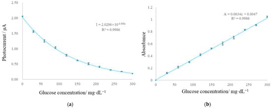 Figure 15a shows the relationship between photocurrent and solution concentration. The curve fitting results show that photocurrent intensity decays exponentially with the linear increase in glucose concentration in solution. The photocurrent generated by the light of the solution with glucose concentration 0 was taken as the photocurrent corresponding to the initial light intensity, and the absorbance of each solution was calculated according to the Beer–Lambert law, as shown in Figure 15b. The results show that the colorimetric sensor module has very good linearity and sensitivity and can meet the requirements of general colorimetric measurement by selecting appropriate light sources and detectors on demand.