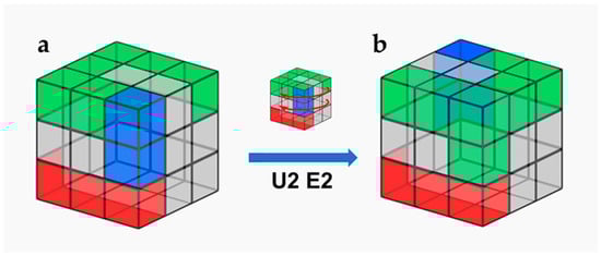 Schematic diagram of two configurations of the Rubik’s cube. (a) Initial configuration of the Rubik’s cube (state 1). (b) The reconfigured Rubik’s cube (state 2) after applying algorithm U2 E2. Red: modules shared by both configurations. Blue: The module used by configuration 1 alone. Green: The module used by configuration 2 alone.