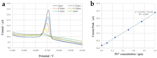 Figure 18a shows differential pulse anodic stripping voltammetry curves of Pb2+ solutions with different concentrations, from which we learned that the dissolution peaks of Pb2+ are approximately −0.7 V. Figure 18b shows the curve of dissolution peak current as a function of concentration, indicating that the sensor has good linearity and sensitivity in the range from 0 ppm to 1 ppm, which can meet the needs for detecting lead ion released by ceramic hollowware according to FDA guidelines [33].