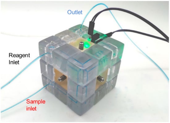 Here we demonstrate the use of the microfluidic cube and colorimetric light sensor module to test glucose concentration in samples. In this application, the absorption peak of the colorimetric product is around 505 nm, so using a cyan LED with a central wavelength of 495–500 nm as the light source can achieve high sensitivity and reduce the influence of irrelevant components on the results. Silicon photodiode BPW21R (Vishay Semiconductor, Malvern, PA, USA) can be used, which has a high sensitivity at this wavelength. The microfluidic cube configuration in this test is shown in Figure 13: turn the inlet/outlet module to both ends of the colorimetric sensing module and then pass the solution to be tested into the module for testing.