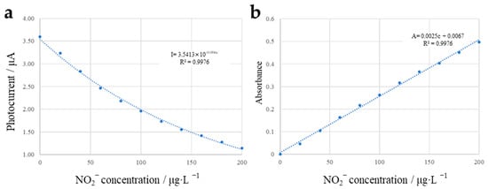 Figure 21a shows the photocurrent received by the silicon photodiode with the change in concentration of NO2− in the sample. It can be inferred from the curve that the photocurrent decays exponentially with the increase in the concentration of NO2−. Figure 21b shows the correlation of the calculated absorbance with nitrite ion, and the two are linearly correlated with a sensitivity of 0.0025 AU/μg·L−1. The results show that the configuration could be used for the detection of nitrite ions with a detection range covering the common range of nitrite concentration in a variety of mediums, such as fermentation broth and aquaculture, and is suitable for the detection of nitrite in aquaculture and food processing applications [34].