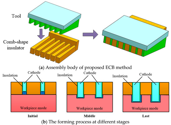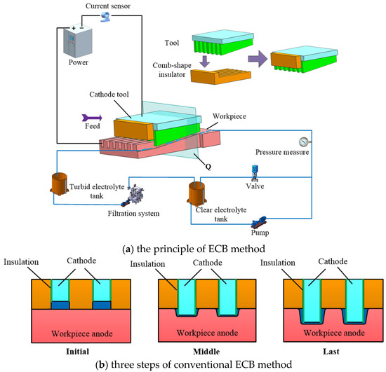 A schematic diagram of the conventional ECB method for micro multi-grooves is shown in Figure 1. The principle of ECB method is shown in Figure 1a. The wedge-shaped tooth cathode tools and the workpiece are connected to the negative and positive poles of the power supply, respectively. The front and rear widths of each wedge-shaped tooth on the cathode tools are equal. Only the lower end face of each wedge-shaped tooth is a bare metal surface, and the other surfaces are covered with insulation layers. Insulating sheets are installed between each adjacent wedge-shaped tooth to expose the wedge-shaped teeth at a certain height. In electrolytic broaching, the insulating sheets’ lower end faces contact with the workpiece’s upper surface, and the electrolyte flows into the machining areas with wedge-shaped teeth from the gaps between the insulating sheets. With the cathode tool moving horizontally along the front of the wedge-shaped teeth, the rear wedge-shaped teeth surfaces protruding from the insulating sheet gradually feed into the workpiece surface and machining micro multi-grooves after the wedge-shaped teeth of the cathode tools pass.