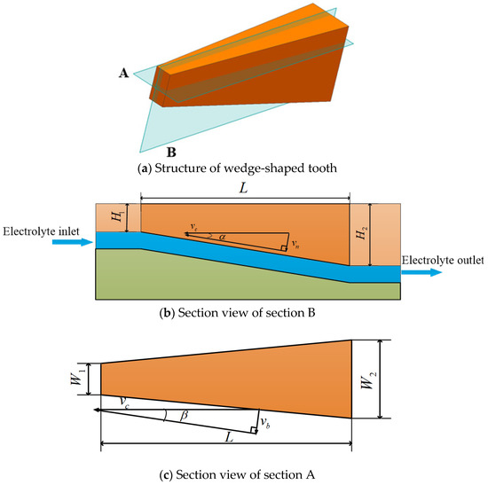 In the ECB process, the feed rate of the wedge-shaped teeth is relative to the workpiece and is determined by the partial speed of the cathode tool feed rate in the direction perpendicular to the anode surface. The relative feed speed is directly related to the structural parameters of the wedge-shaped teeth. The structure of wedge-shaped tooth is shown in Figure 3a. The vertical and horizontal sections of a single variable-width wedge-shaped tooth are shown in Figure 3b,c, which is section B and section A, respectively. When the variable-width ECB cathode tool is fed at the rate , the feed rate between the cathode tool tooth and the workpiece anode along the slot depth direction is calculated from Equations (1) and (2). The feed rate between the cathode tool tooth and the workpiece anode along the slot width direction is calculated from Equations (3) and (4).