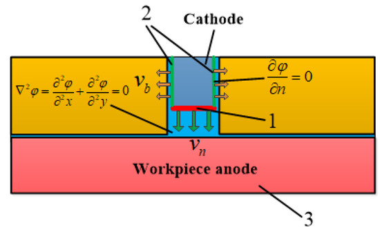 Line 1 in Figure 4 is the low-end face of the cathode tooth, moving vertically and straight downward at speed . Line 2 is the sidewall of the cathode tooth, which moves horizontally along a straight line at speed to the left and right sides. Under the electrochemical anodic dissolution reaction, the workpiece material is dissolved into the electrolyte at the rate which obeys Faraday’s law: