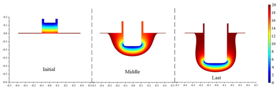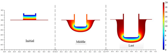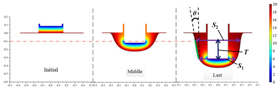 Based on previous research, the ECB cathode tool structural parameters are shown in Table 1. The forming process at different stages, when the wedge-shaped tooth tool passes through a particular section of the workpiece, is shown in Figure 1b. In ECB processing, the electrolyte flows perpendicular to the cross-section of the simulation model, and the electrolytic products, such as bubbles, anodic dissolution products, and Joule heat, are approximately uniform over the cross-section. In addition, because the wedge tooth length is only 20 mm, there is no apparent accumulation of the electrolytic products over the short electrolyte flow length. Therefore, the influence of electrolytic products on the anode-forming process is ignored in the simulation.