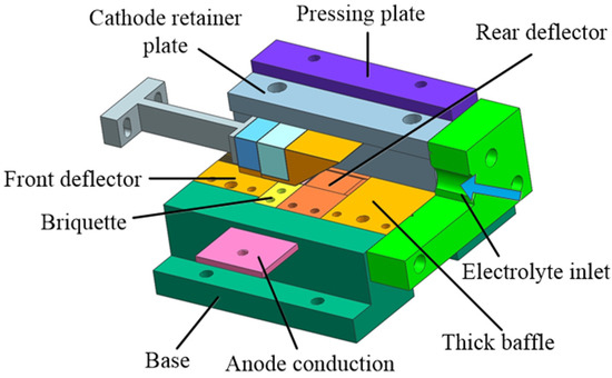 The cathode guide block is made of insulating material to shield the electric field corrosion so that the processing of a groove is prevented from affecting the adjacent grooves. Epoxy resin is used as the insulation layer for the cathode edge plating. The liquid epoxy resin is closely attached to the side wall of the cathode edge by electroplating so as to avoid the stray corrosion of the side wall of the cathode edge on the tank during the electrolytic broaching process. The three-dimensional structure of the cathode assembly and an exploded view are shown in Figure 9.