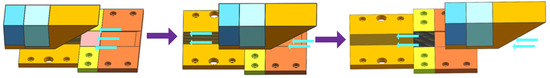 The processing process of the ECB micro multi-grooves is shown in Figure 11. At the initial stage of ECB, the cathode tool is located at a certain distance from the workpiece. The electrolyte flows into the flow channel inside the fixture at a high velocity from the inlet and is separated into multiple streams by the guide block to enter the machining gap of each microgroove. After applying the processing voltage, the cathode tool feeds horizontally to the workpiece at the feed rate of 120 mm/min. When the wedge-shaped tooth tool cuts into the workpiece, the anode material of the workpiece is eroded and dissolved, and all the micro-grooves will be processed at the same time.