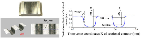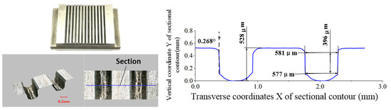 The ECB specimens for the conventional and optimized cathode tool structures are shown in Figure 12 and Figure 13, respectively. A laser confocal microscope (VR-5000, Keyence, Osaka, Japan) is used to measure the geometric profiles of the micro multi-grooves. Each microgroove’s sidewall taper, depth, and width values are measured three times, and the average value is taken as the final.
