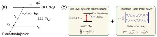 The theoretical models used to study multi-mode dynamics and frequency combs in QCLs: (a) the electron transportations in QCLs based on which the reduced rate equation model was developed; (b) Maxwell–Bloch Equations that combine the Bloch equation and the wave equation to study optical frequency combs in QCLs. (Figure modified from Ref [47], reprint with the permission of Optica publishing group).
