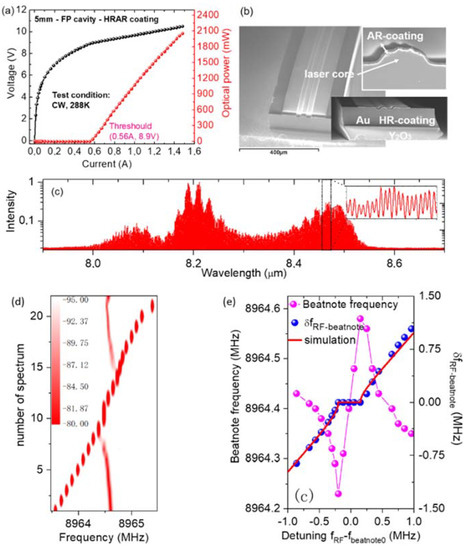 Then, injection locking and harmonic injection locking were also demonstrated in mid-infrared QCL through direct microwave modulation [56,57]. As shown in the light-current-voltage (LIV) curve and the spectrum in Figure 2a,c, the QCL with a broadband emission spectrum spanning 8.0–8.6 μm is capable of delivering high optical power of over 2 W from a single facet in CW operation at approximately room temperature. Figure 2b also gives the scanning electron microscope (SEM) image of the high-power long-wave infrared QCL. Figure 2d shows the evolution of the beatnote (continuous branch) of the QCL as a function of the injected RF frequency (discrete branch). Figure 2e shows the beatnote frequency (magenta) as a function of the detuning δ between RF frequency fRF and the beatnote without RF injection Δf0. The blue shows the frequency difference δfRF−beatnote between RF and beatnote as a function of detuning δ. From these two figures, we can clearly see that the beatnote frequency is locked to the injected RF frequency. However, the locking range is less than 1 MHz due to much higher intra-cavity power compared with the result in Ref [56]. This experiment was also in agreement with the injection-locking theory described by Equations (5)–(7).