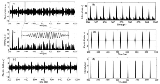 (a) Calculated electric field of laser emission from 200 ps to 1000 ps with a femtosecond time resolution with a time-dependent phase and φm = 0. (b) Intensity of laser emission corresponding to (a). (c,d) Calculated lasers emission with Δfm = 0 but phase ϕm of each mode is different: (c) Electric field from 200 ps to 1000 ps and (d) Intensity corresponding to (c). (e) Electric field of a mode-locked laser emission as a function of time. (f) Intensity corresponds to the electric field above.