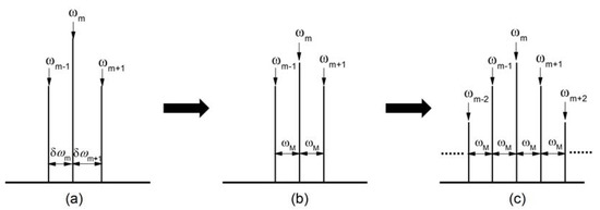 Here we present active mode-locking as it is the most adapted for pulse generation from QCLs. Generally, we employ an electrical modulation ωM, which is monochromatic and very close to the mode spacing δω, to modulate a laser directly (i.e., modulation at the round trip of the cavity). Firstly, let us consider the modulation effect on the frequency ωm, as is illustrated in Figure 5a. Before modulation is applied, the free-running emission mode spacings are not identical δωm ≠ δωm+1. When modulation is applied, the central frequency ωm will transfer a part of its energies to its modulated sidebands (ωm + ωM, ωm − ωM) and will be close in frequency to the two free-running modes (ωm−1, ωm+1) of the cavity. If the modulation power is strong enough, it will force the free-running frequencies (ωm−1, ωm+1) to move towards the sidebands’ frequencies positions at (ωm + ωM, ωm − ωM) until they totally overlap ωm−1 = ωm − ωM, ωm+1 = ωm + ωM. Finally, the mode spacing will be locked to the modulation frequency δωm = δωm+1 = ωM, as presented in Figure 5b.