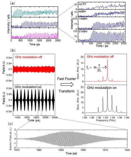 Immediately after the development of this injection seeding technique, mode-locking of THz QCLs was realized and demonstrated in time domain [32,33,34,64]. A series of important work was published on this research topic, showing that THz QCLs could be mode-locked for short pulse generation. Figure 7a shows the THz intensity emitted by an actively mode-locked QCLs over picosecond time scales (without a seed). Both the initiation of mode-locked pulses and the steady-state regime were examined. For bias conditions well above threshold, a sinusoidal modulation of the emission was achieved; however, when the QCL was biased around threshold and the round-trip modulation was strong, Gaussian-shaped transform limited mode-locked pulses with a full width at half maximum (FWHM) of 19 ps were observed. Figure 7b shows the electric field (left) and its corresponding spectra (right) of QCL emission with and without round-trip modulation, respectively, in the time domain using the injection seeding technique. The method relied on synchronizing the mode-locked pulses to a reference laser and was applied to 15-ps pulses generated by a 2-THz QCL. The pulses from the actively mode-locked laser were completely characterized in field and in time with a sub-ps resolution, allowing us to determine the amplitude and phase of each cavity mode. Figure 7c shows the zoom in of a light pulse from the mode-locked QCL. We can clearly resolve the oscillation of the electric field of the laser emission.