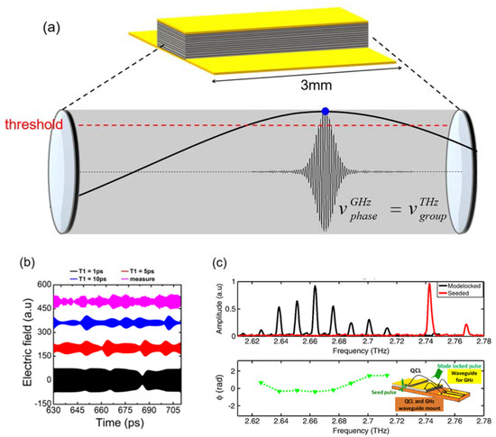 An alternative ultrafast detection technique called the “injection seeding technique” has also been developed [63]. This technique has the full capability to measure all the information of QCL emission in time domain, including phase, amplitude, intensity, spectrum, and full electric field, as shown in Figure 6. This provides the possibility to observe directly pulse-train generation and has paved the way for QCL mode-locking demonstration directly in time domain.