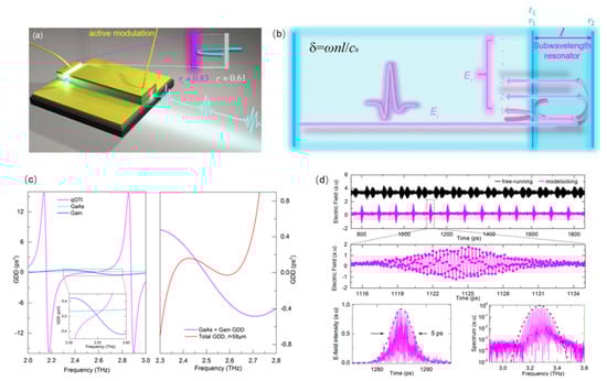 To realize a mode-locked pulse train, a monolithic on-chip dispersion compensation scheme to shorten the THz pulses of mode-locked QCLs was proposed [26]. This was based on the realization of a small coupled cavity resonator that acted as an ‘off resonance’ Gires–Tournois interferometer (GTI), permitting large THz spectral bandwidths to be compensated, as shown in Figure 9. In this work, the THz pulses of mode-locked QCLs was considerably shortened from 16 ps to 4 ps. This permitted the compression of THz pulses of mode-locked QCLs beyond the 10 ps barrier that had stood for several years. This result marks an important milestone in exploring ultrafast light-pulse generation from mode-locked QCLs. The novel application of a GTI also opens up a direct route to sub-picosecond and single cycle pulses in the THz range from a compact semiconductor source.